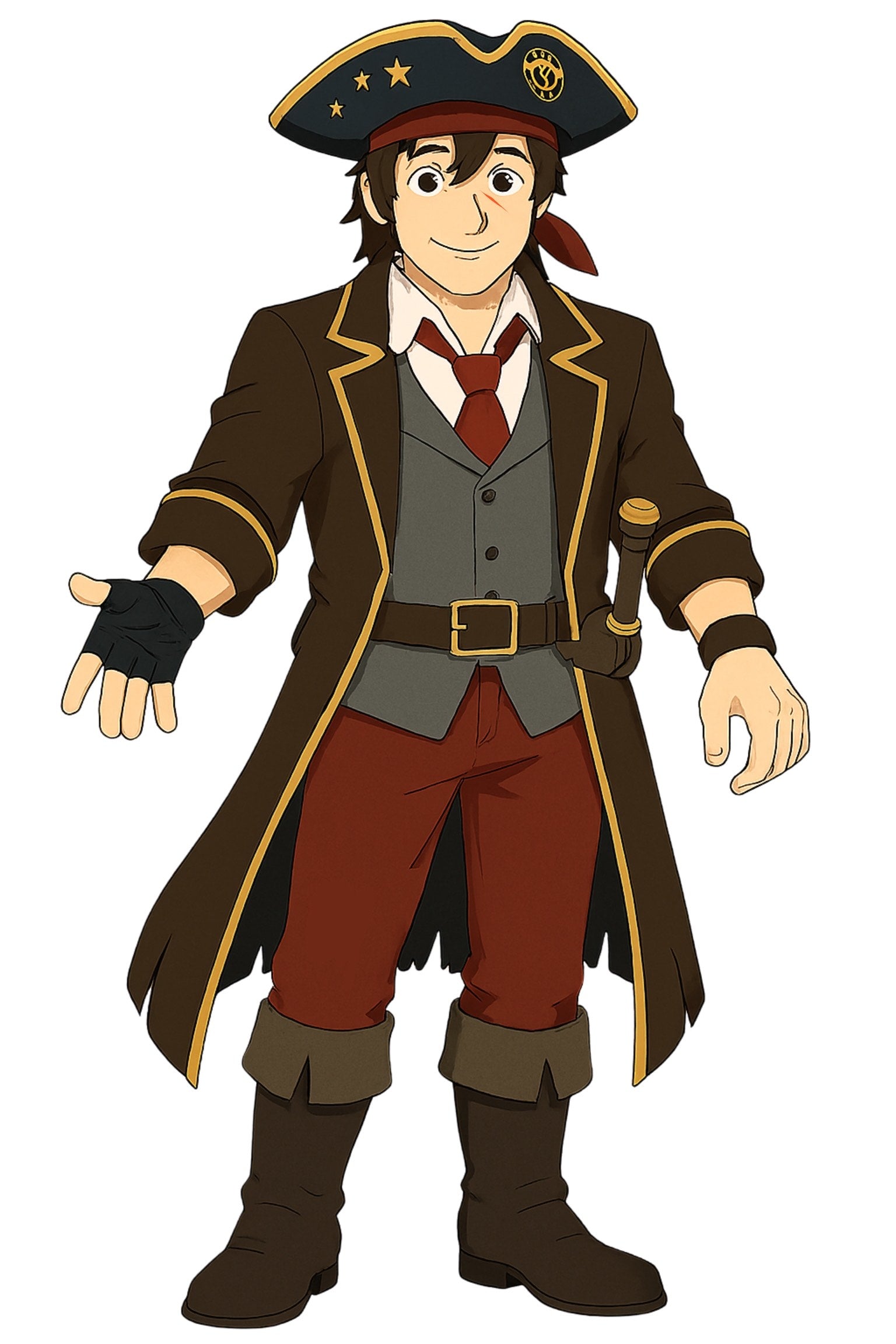 Captain Sparrow is a stylish, anime-inspired pirate with sharp charisma and a flair for theatrics. Dressed in gold-trimmed gear and armed with a sword, he leads with charm, strategy, and swagger—more rogue diplomat than brute force. His inviting stance hints at clever plans and untold adventures.