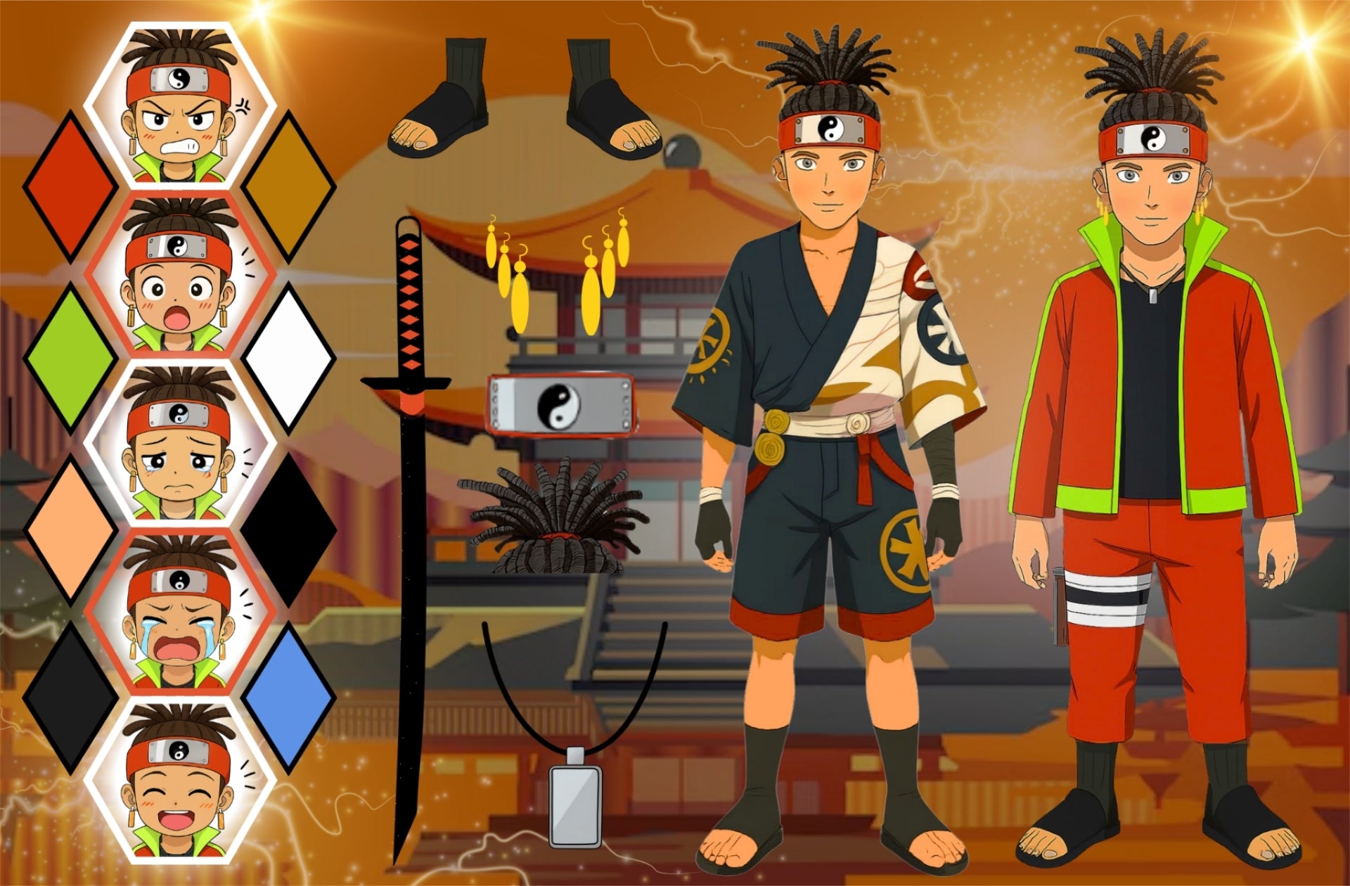 This character sheet features a fierce anime warrior with two outfits—classic martial arts and modern ninja—plus expressive emotes and themed gear like a katana, kunai, and yin-yang accessories. Set against a dramatic temple backdrop, it’s a complete visual kit for storytelling, animation, or game design.