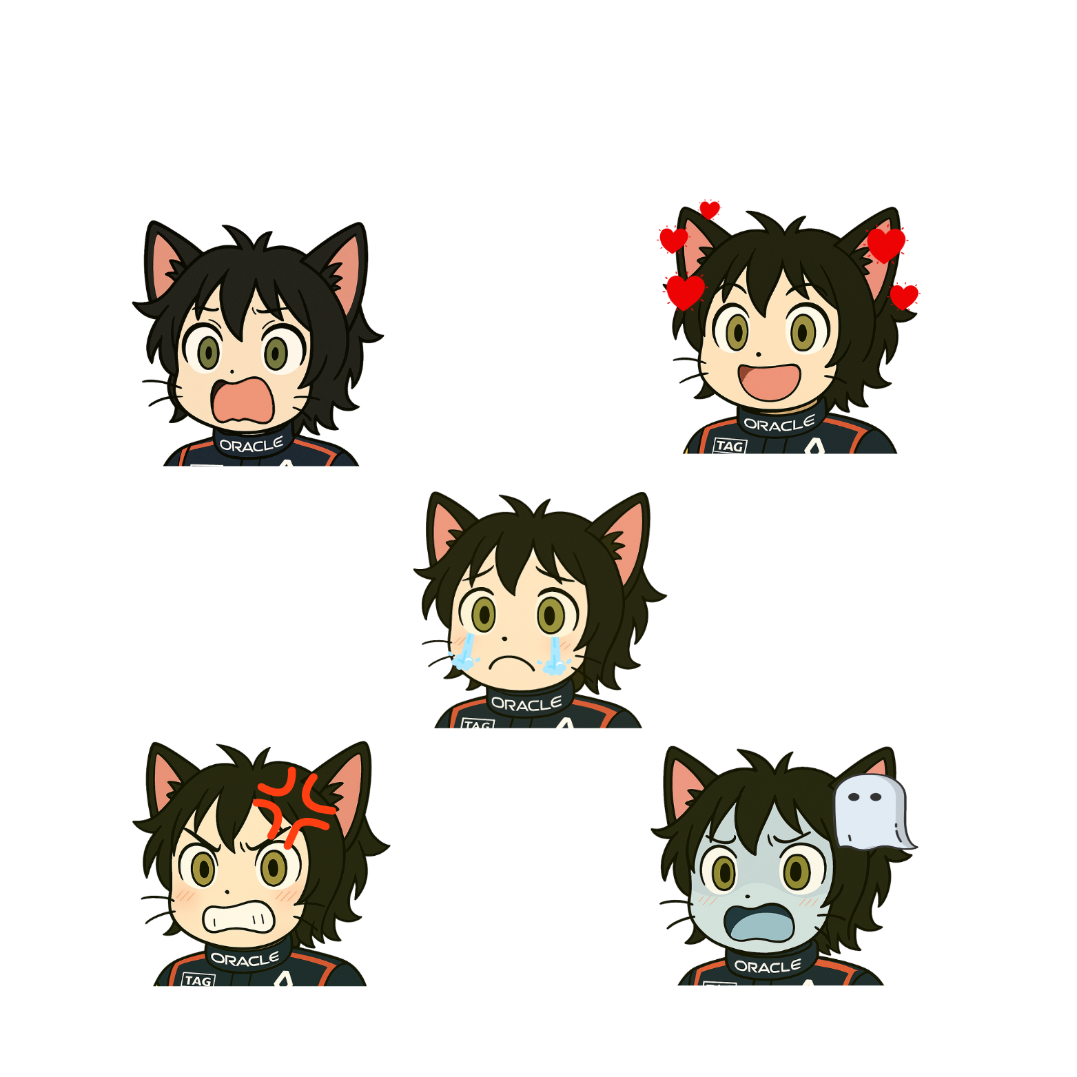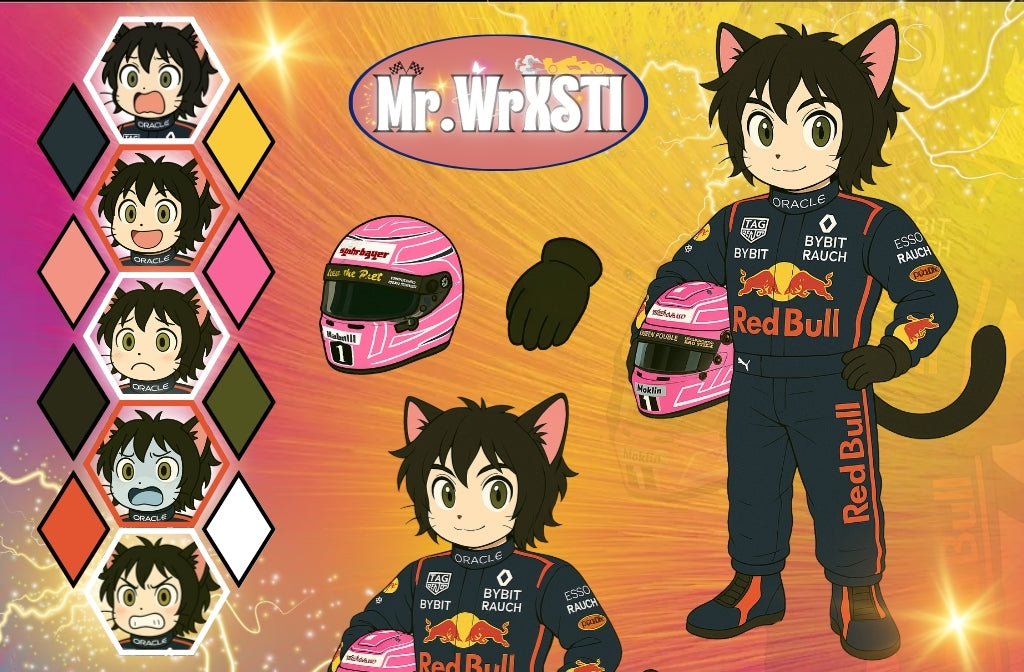 Mr. WrKSTI’s character sheet bursts with energy, blending feline flair with Formula 1 swagger. Decked out in a Red Bull Racing suit and his signature pink helmet, he’s a confident, expressive racer built for speed and style. The sheet features two dynamic poses and eight vibrant emotes, each capturing a different emotion