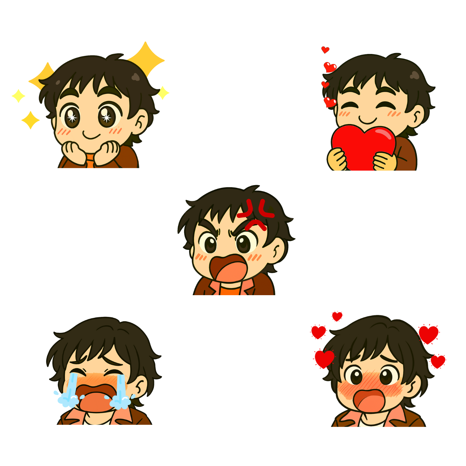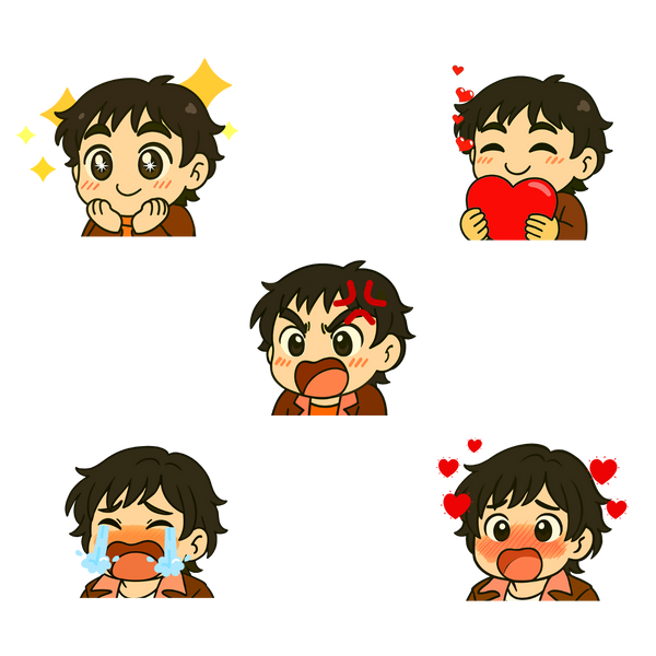 Featuring a bold, expressive character in a red-orange tee, each emote captures a moment of pure emotion—from surprise to joy to full-on laughter. Whether you're reacting to chat, celebrating a win, or just vibing with your community, these emotes bring instant personality and connection.