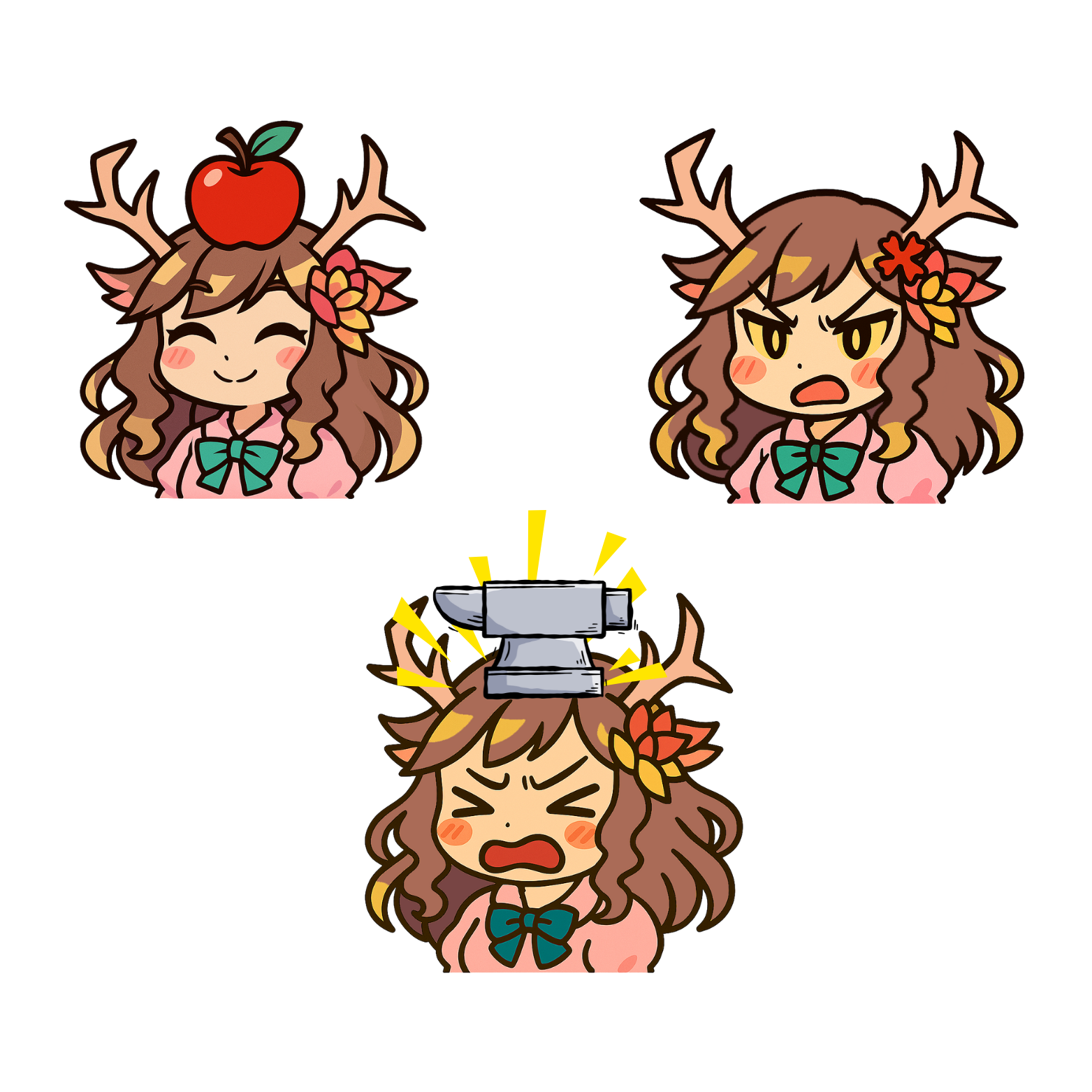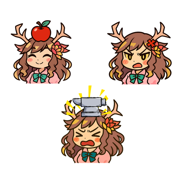 This character is a cute, deer-themed anime girl with expressive emotes. She has long, wavy brown hair, antlers decorated with flowers, and wears a bow on her outfit. Her design blends nature and charm, giving her a whimsical, forest-spirit vibe.