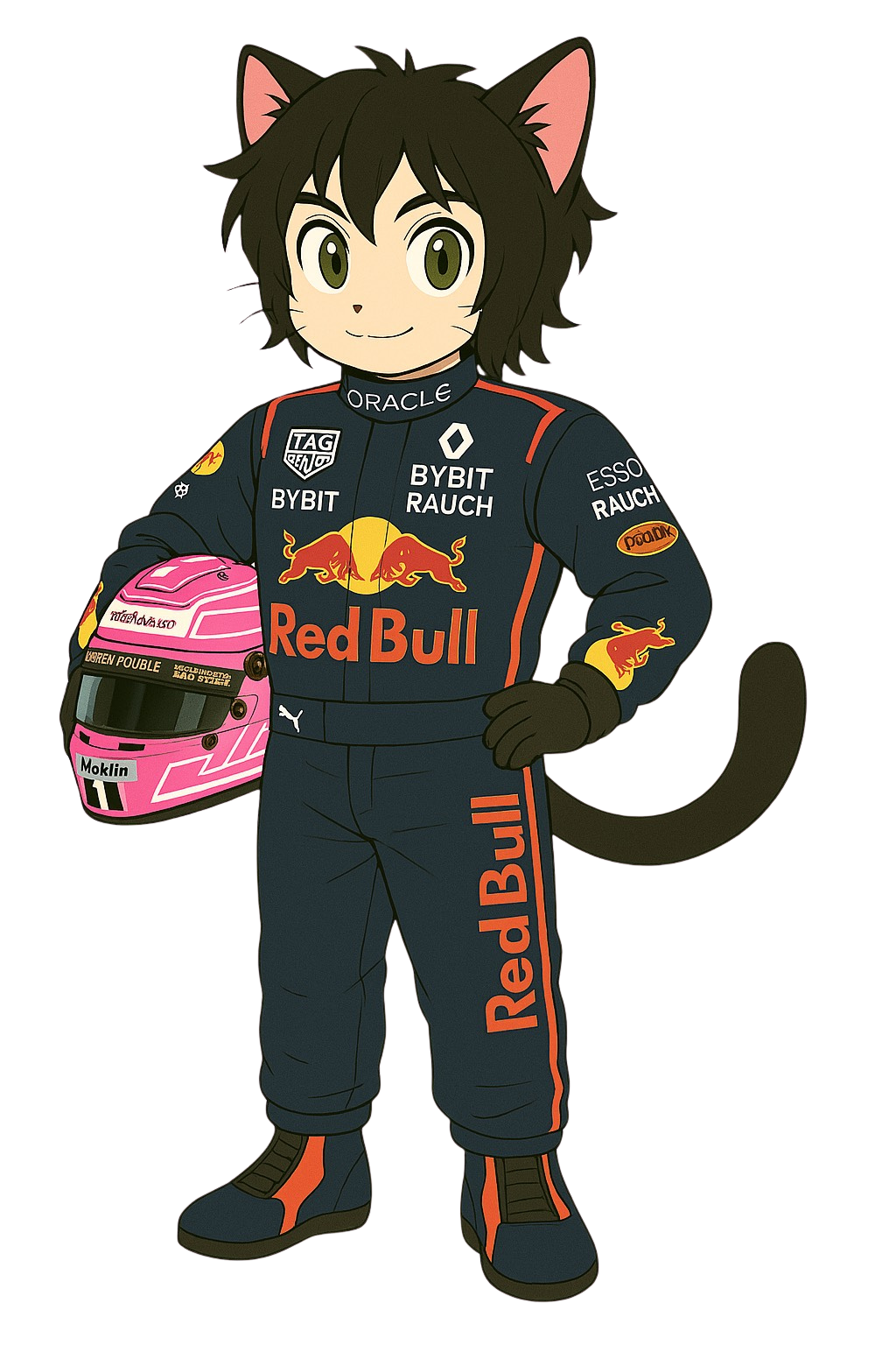 “Speedpaw” is a quick-witted and fearless catboy racer representing Team Red Bull. Known for his lightning-fast reflexes and cool-headed charm, PAW dominates the track with feline precision and confidence. His sleek racing suit and signature pink helmet make him instantly recognizable, while his playful grin and twitching tail remind everyone, he’s here to win, and have fun doing it.