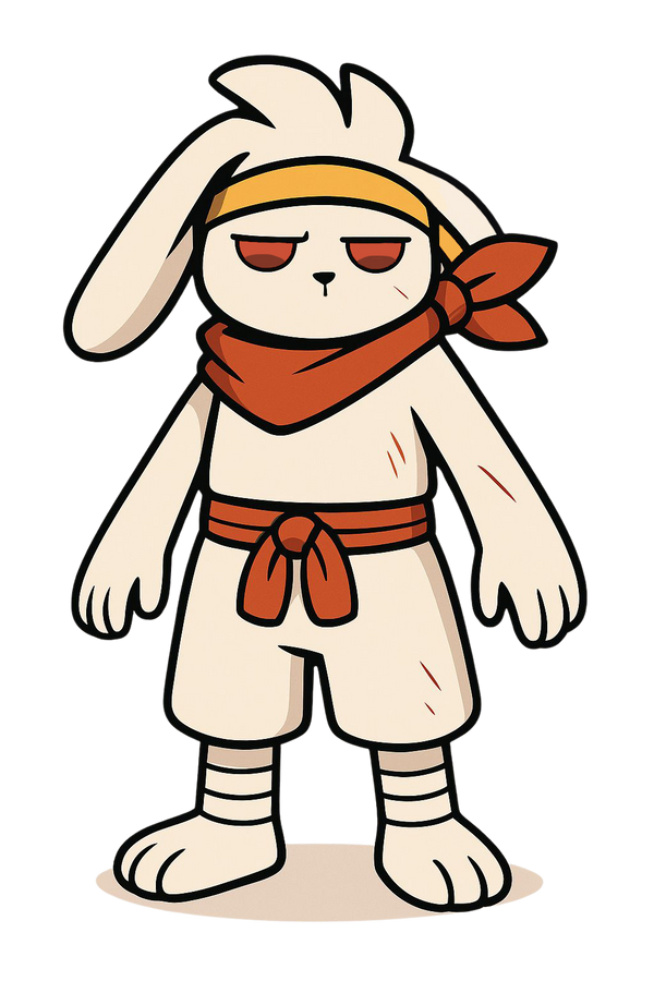 Ironpaw is a battle-hardened martial arts rabbit, drawn in a bold cartoon style that blends cuteness with grit. With a yellow headband, red scarf, and bandaged feet, he stands upright in a disciplined pose, eyes half-closed in quiet focus. Scratch marks on his limbs hint at intense training or recent combat.